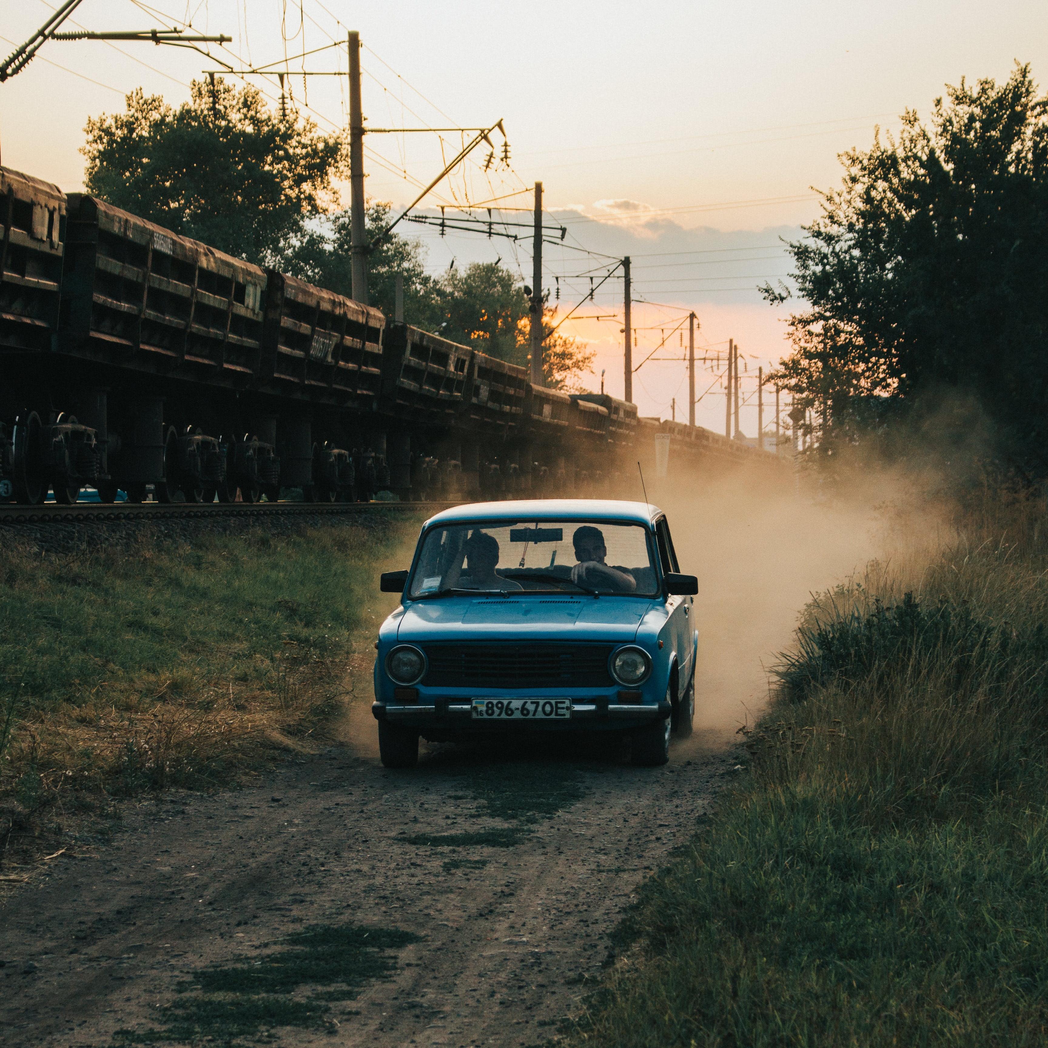 a blue car driving down a dirt road near train tracks | ||